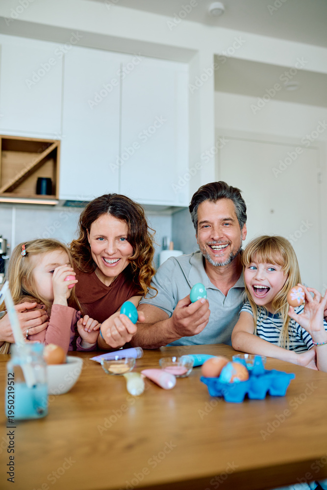 Happy family looking at camera while decorating Easter eggs at a modern kitchen table, celebrating springtime holiday tradition #1950219512
