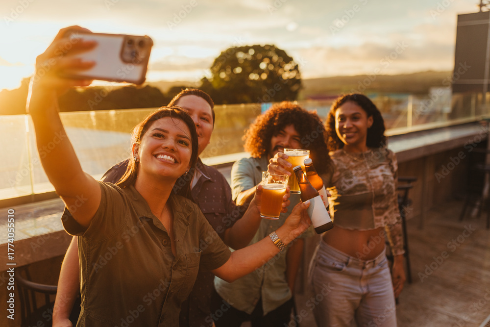 Happy friends making a toast and taking a selfie at sunset #1774055510