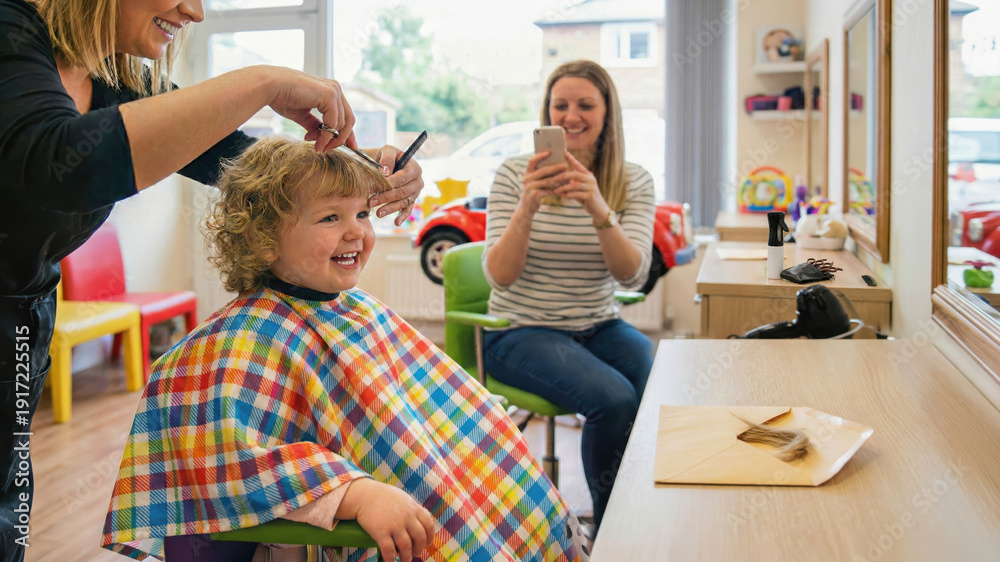 Happy little girl getting a haircut in a salon while her mother takes a photo. The smiling toddler sits in a colorful cape for her first haircut near a keepsake lock of hair in an envelope. #1917225515