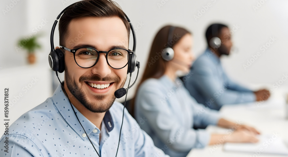 • #1596371812 Happy Male Call Center Agent Smiling at Camera, Technical Support and Customer Service Concept.