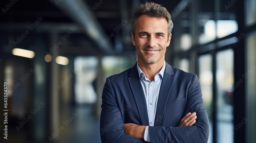 Happy male executive company owner corporate manager leader in office, confident smiling business man professional coach wear glasses stand arms crossed staring at camera. generative ai #645524370