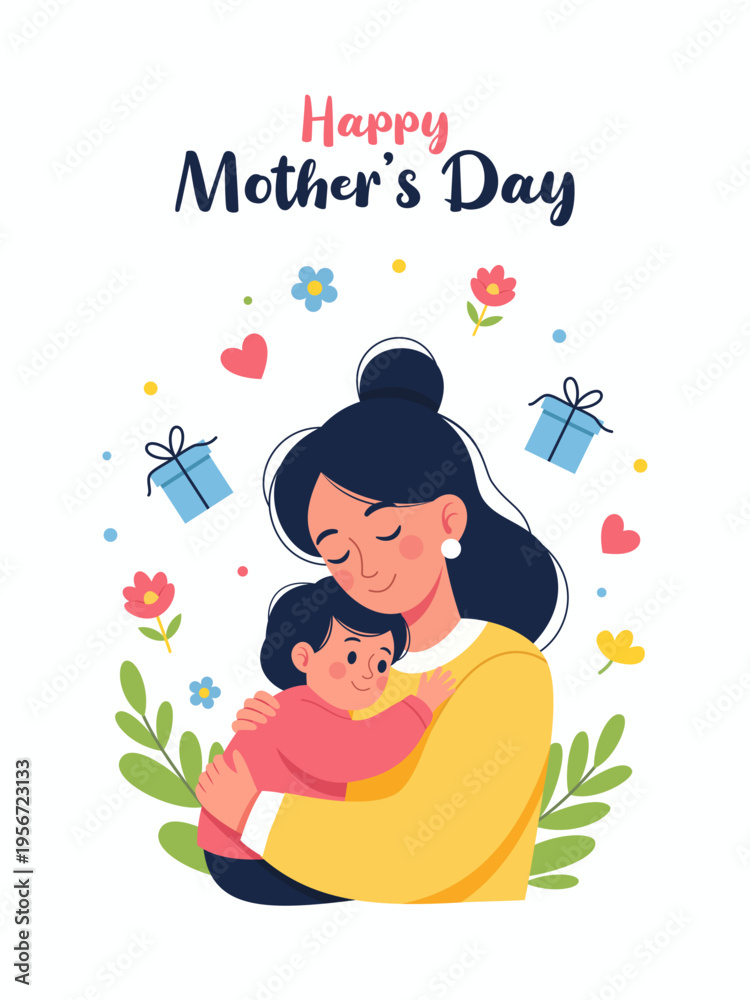 Happy Mother's Day greeting card illustration with a mother hugging her child, isolated on a white background #1956723133