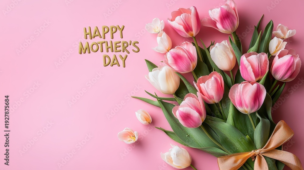 Happy Mother’s Day greeting with pink tulip bouquet on pastel background #1927875684