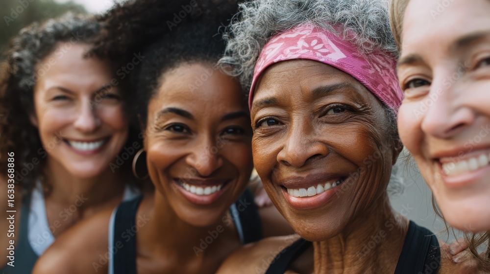 happy multi generational women having fun together multiracial friends smiling on camera after sport workout outdoor main focus on african female face no logos no brands ar 169 #1638368886