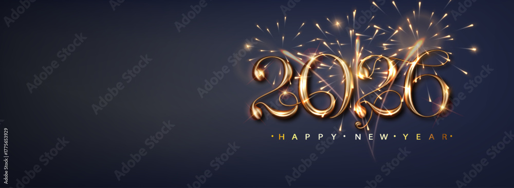2026 Happy new year banner with flickering fireworks. Luxury background with golden metallic numbers date 2026. Vector holyday illustration. #1775653929