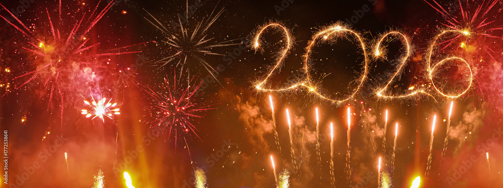 happy new year, new year's eve, silvester, new year, celebration greeting card, new year card long panorama - Year 2026 in sparkler font and firework fireworks pyrotechnic, on night sky background #1772538641