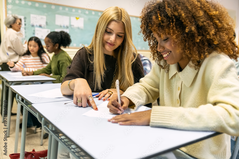 Happy students working on assignments, with one student helping another. Diverse group engaged in education and teamwork #1974304769