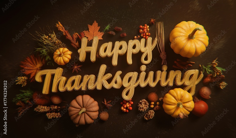 Happy thanksgiving written in cursive and surrounded by autumn elements as a typography design poster art piece #1774329202