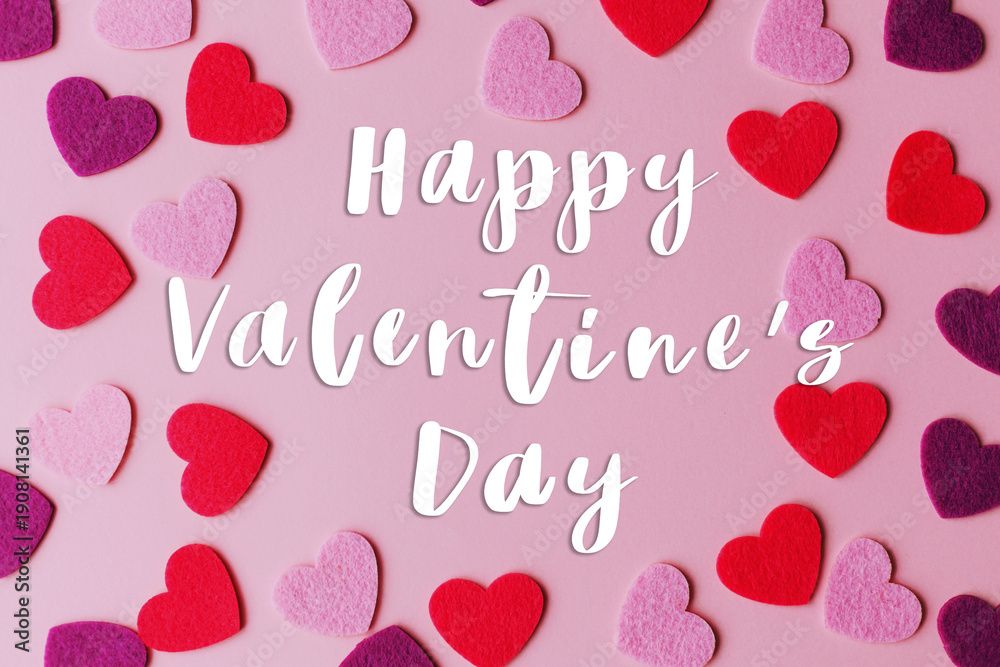 Happy valentines day greeting card. Happy Valentine's day text and stylish pink and red hearts flat lay on pink paper background. love banner. #1908141361