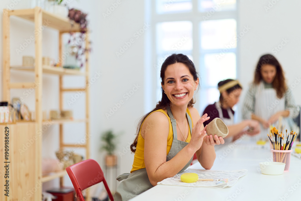 Happy Woman Crafting Pottery in Bright Studio With Friends, Art Supplies, and Focus #1909188629
