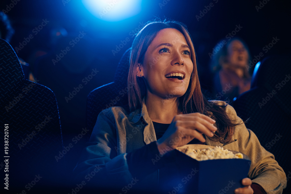 Happy woman eating popcorn during film screening in theater. #1938720761