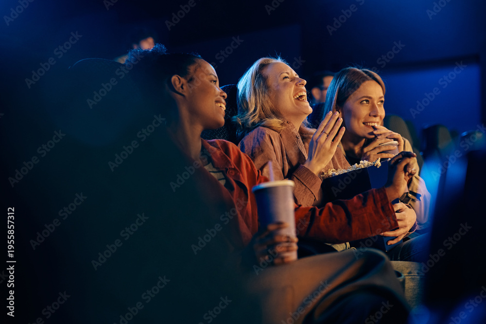 Happy woman laughing while watching comedy film with her friends at movie theater. #1955857312