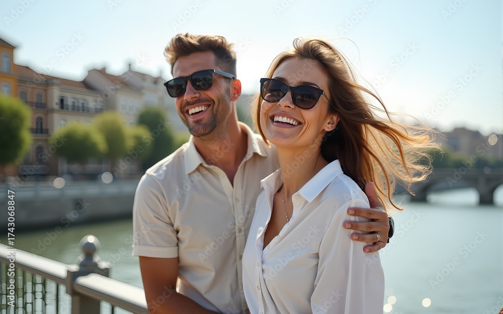 happy woman with windy hair in sunglasses smiling, stylish couple in love having fun on bridge in the summer city. modern woman and man in fashionable white clothes embracing at the river #1743068847