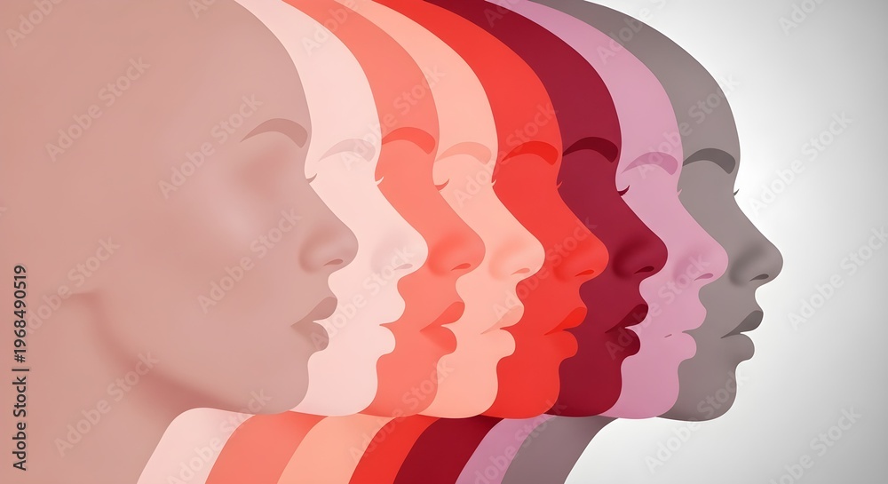 Happy Women’s Day Concept Illustration with Diverse Female Profiles in Gradient Red Tones, Symbolizing Empowerment, Equality, Diversity, and Feminism – Perfect for Social Media, Posters, Campaigns #1968490519