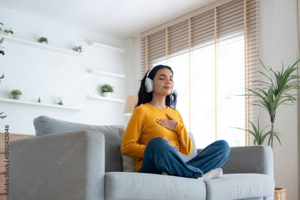 Happy young Asian woman practicing yoga and meditation at home sitting on couch in living room in lotus position and relaxing with closed eyes. Mindful meditation and wellbeing concept #1900423046