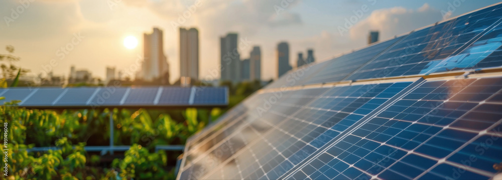 Harnessing Energy: A cluster of solar panels captures the sun's rays, symbolizing renewable energy within an urban backdrop, representing a sustainable future. #1931496048