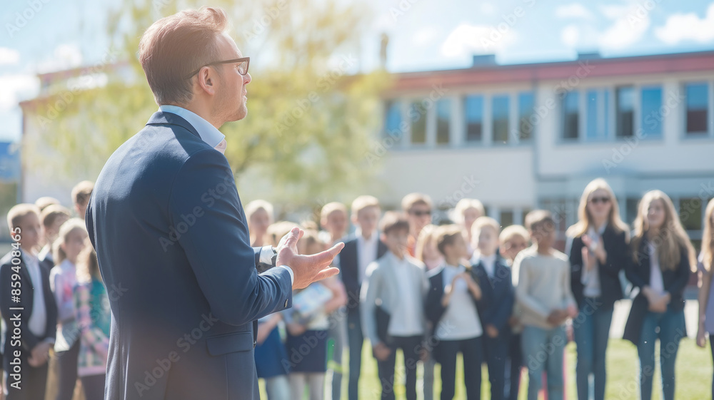 Head teacher and principal speaking to group of students outside school building on sunny day creating an engaging and interactive atmosphere #859408465
