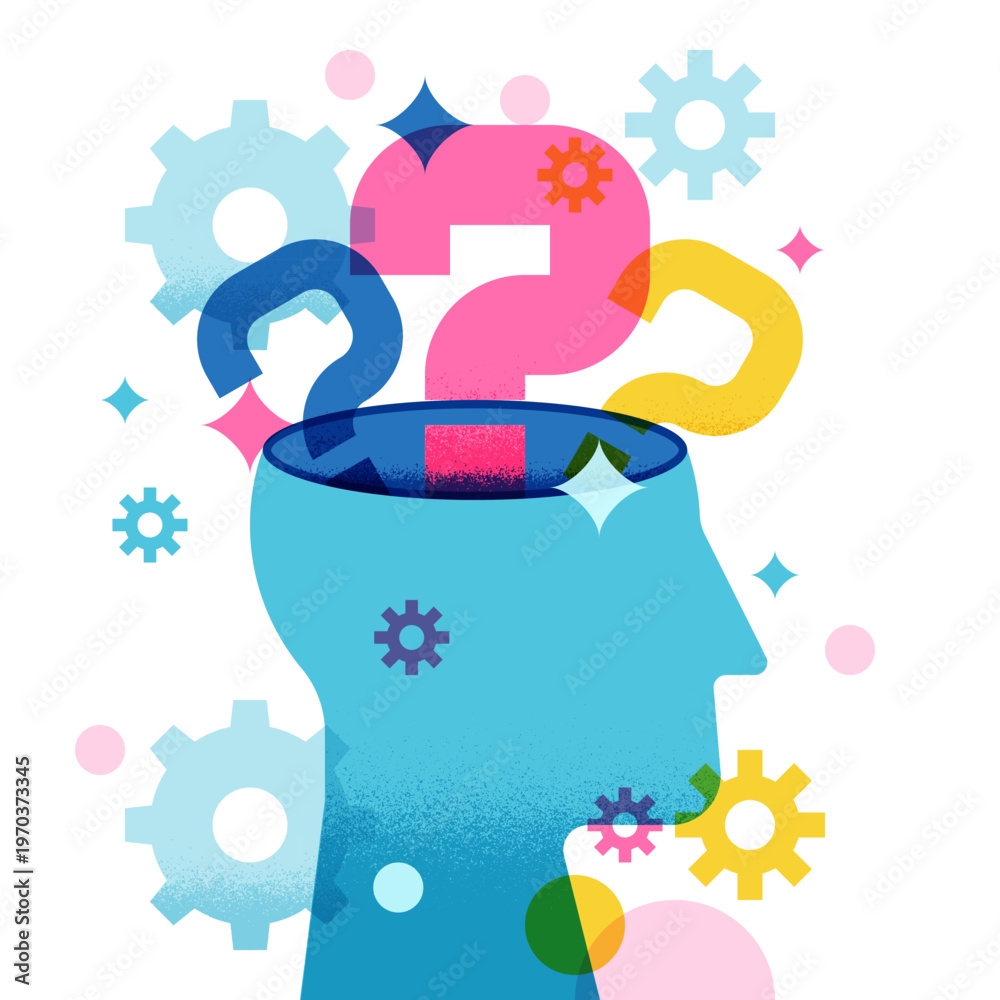 Head with multicolored question marks and gears. Vector concept of thinking, problem solving, psychology decision making #1970373345