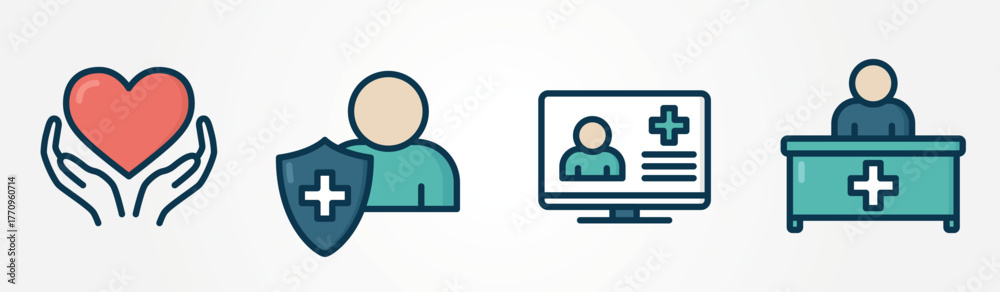 Healthcare icon set. Heart protection, online health portal and medical administration symbols. Isolated vector color image. Hand drawn original illustrations. #1770960714