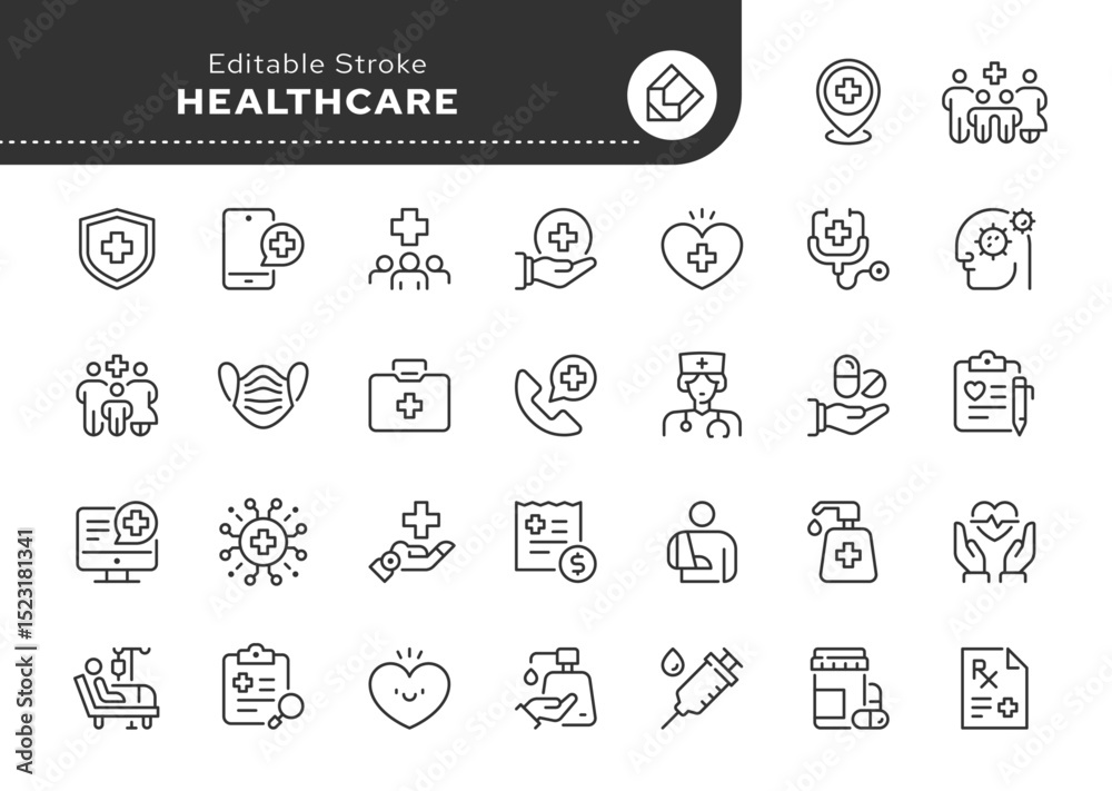 Healthcare line icon set. Medicine, medical service, health, care, doctor, hospital, patient, treatment, sick, illness and more. Outline icon in linear style. Vector collection. #1523181341