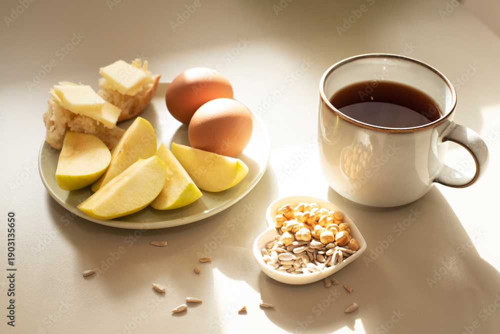 Healthy Breakfast with Boiled Eggs, Apples and Black Coffee #1903135650