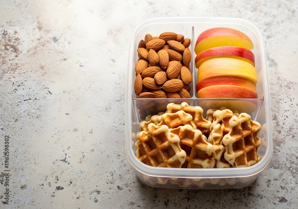 Healthy eating is fun and easy when you pack a school lunch or work snacks ahead of time with almonds, waffles, and sliced apples in a handy plastic container, keeping portions in check #1967598302