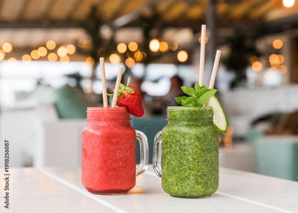 Healthy fresh red and green smoothies in a juice glasses with straws on a white table in a café restaurant. #1918256087