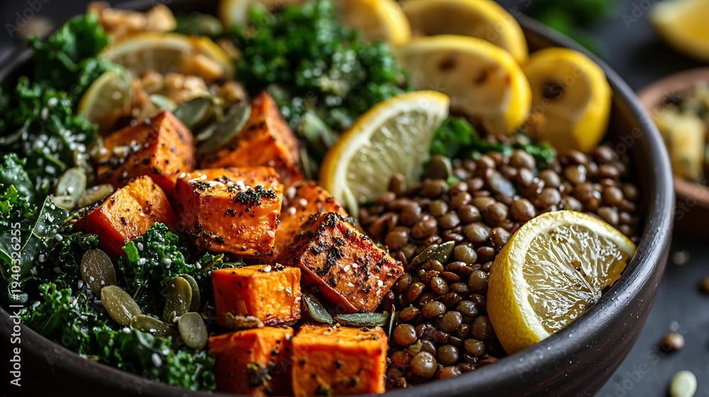 Healthy Grain Bowl With Roasted Sweet Potatoes Kale Lentils And Lemon Slices #1940326255