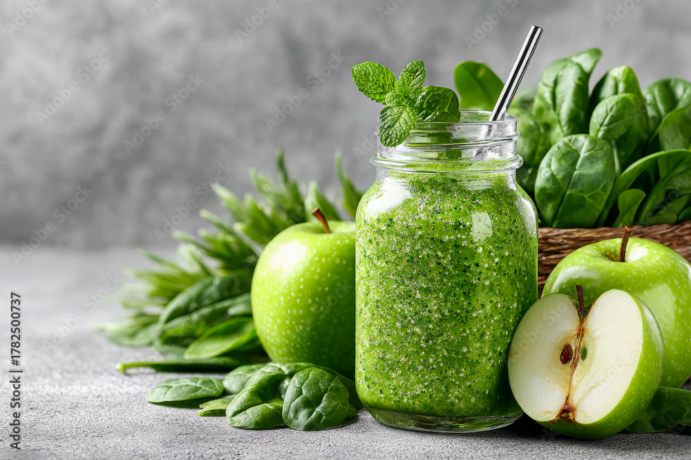 Healthy green spinach apple smoothie in glass jar with metal straw and fresh ingredients on gray background #1782500737