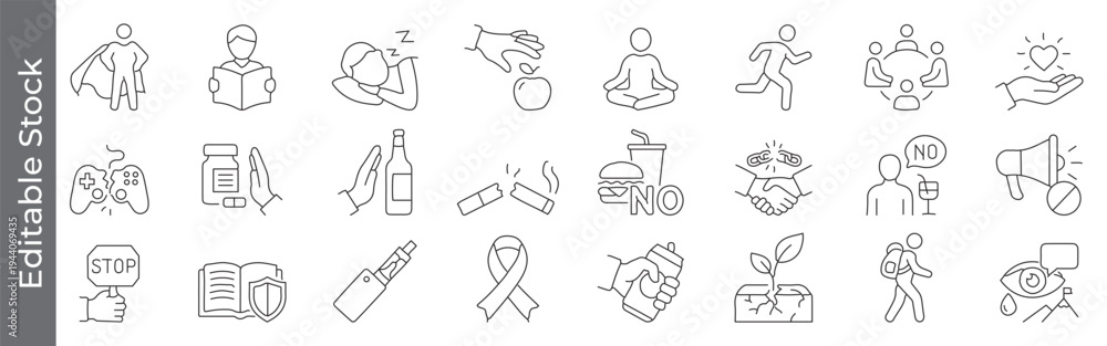 Healthy lifestyle and wellness habits icon set – editable outline symbols of exercise, meditation, nutrition, no smoking and self-care #1944069435
