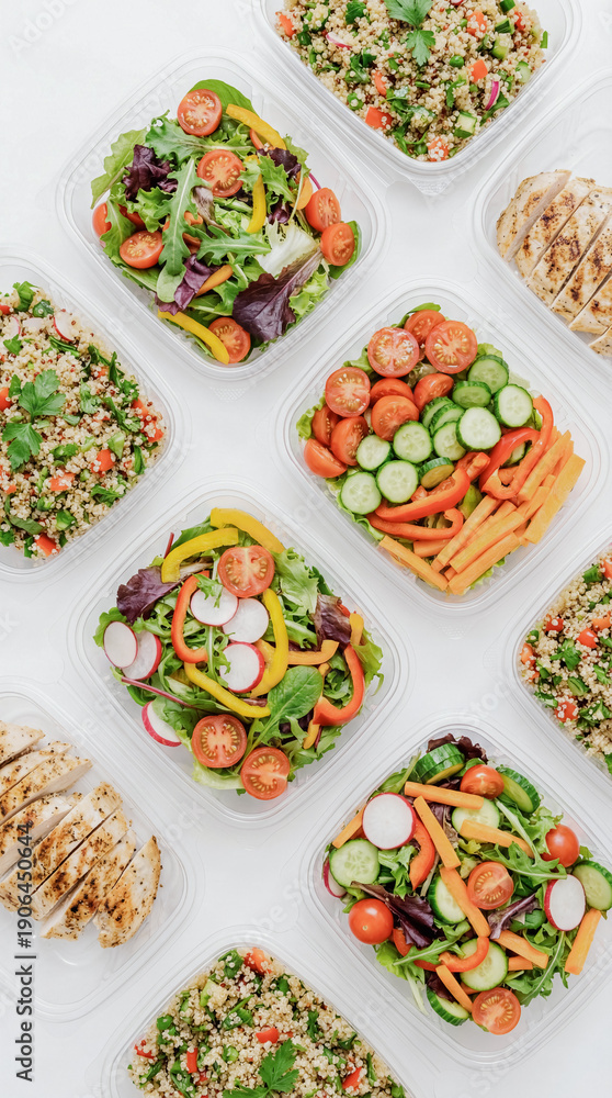 Healthy meal prep with fresh salads and grilled chicken #1906450644