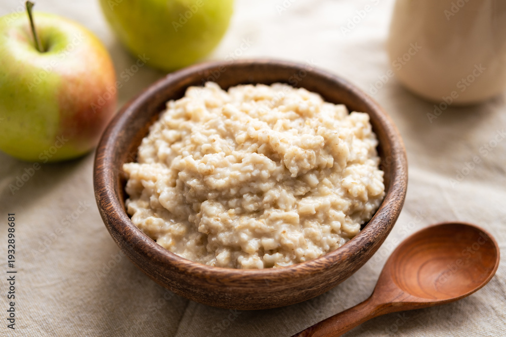 Healthy vegetarian gluten free breakfast. Bowl of plain oatmeal porridge served with whole green apple on side #1932898681