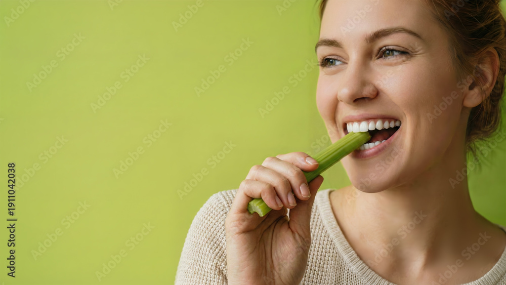 Healthy woman eating celery stick, biting fresh vegetable snack. Smiling female portrait with white teeth on green background, organic diet wellness concept. #1911042038
