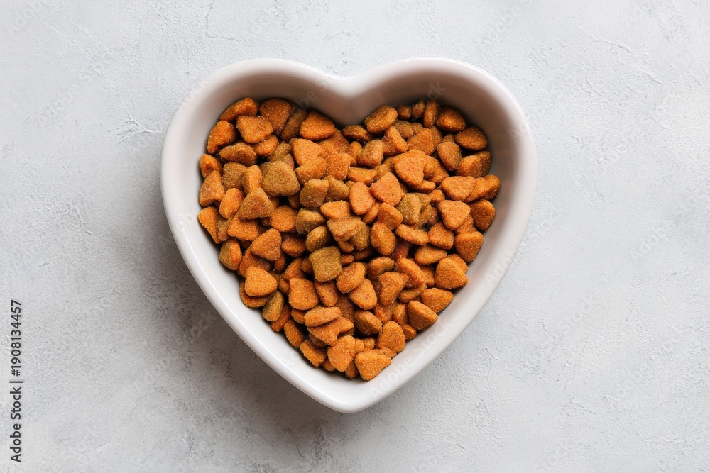 Heart-shaped bowl filled with brown and orange pet food on light background #1908134457