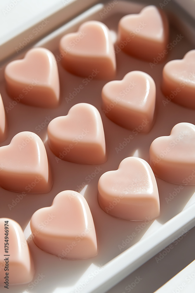 Heart-shaped candies on a white tray symbolize love and sweetness. Perfect for romantic celebrations or a delightful treat, arranged in neat rows, casting soft shadows. #1754946974