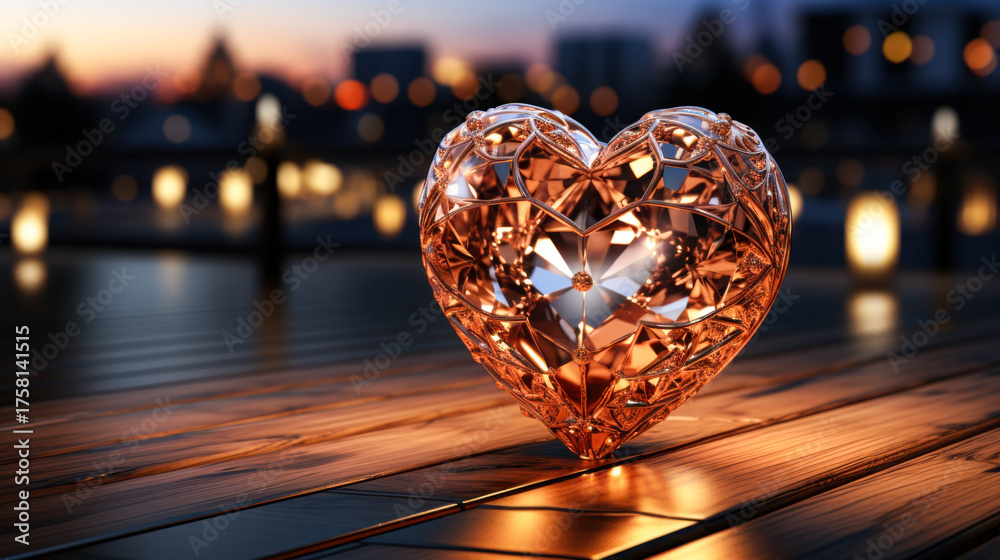 Heart-shaped crystal positioned on a wooden surface with a blurred warm background during an evening setting #1758141515