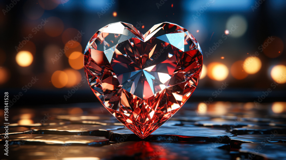 Heart-shaped crystal positioned on a wooden surface with a blurred warm background during an evening setting #1758141528