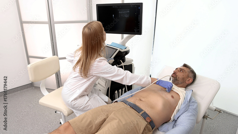 Heart ultrasound exam for adult man with ultrasound specialist while medical exam at hospital #1768179442