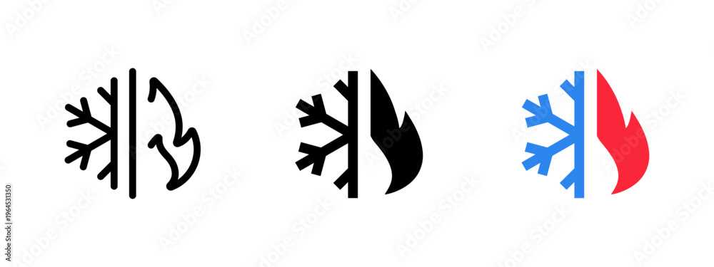 Heat and freeze icon with flame and snowflake representing hot and cold. Temperature, thermal energy and freeze or heat symbol for climate, environment and thermal concepts. #1964531350
