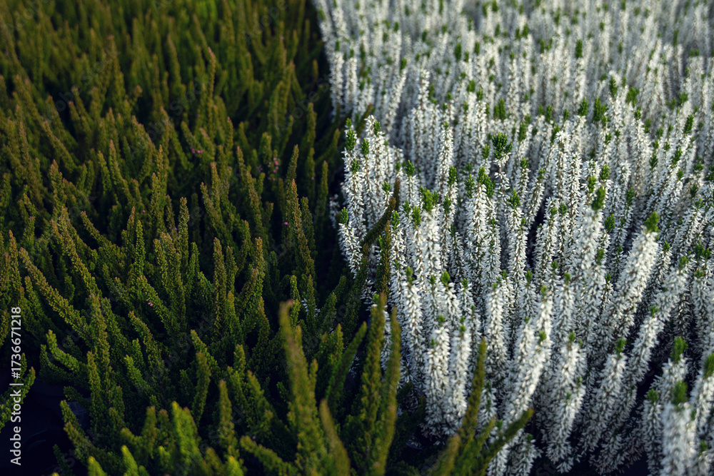 Heather green shrub, white flowers and color contrast with spiky stems create a textured pattern in a split view of heather plants in a garden bed overhead #1736671218