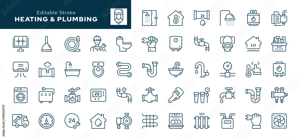 Heating and plumbing. Set of outline icons. Plumber, pipe, boiler, tap, meter, toilet, heated floor, gas wrench and more. Line icon in linear style. Vector collection #1961330707