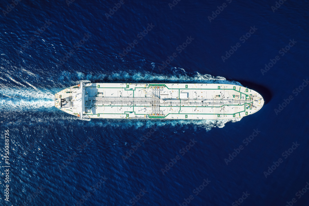 High aerial top view of a crude oil tanker traveling with speed over the ocean with copy space #1950088736