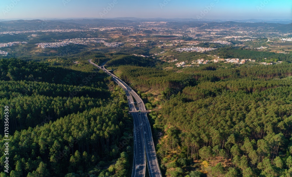 High-angle view of a highway cutting through a forested landscape, overlooking a city #1703560530