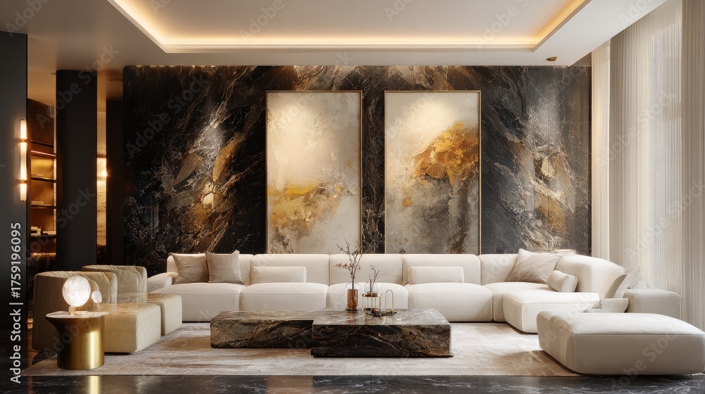 High-end apartment living room featuring black marble texture, minimalist white sofa, golden art pieces, and soft lighting #1759196095