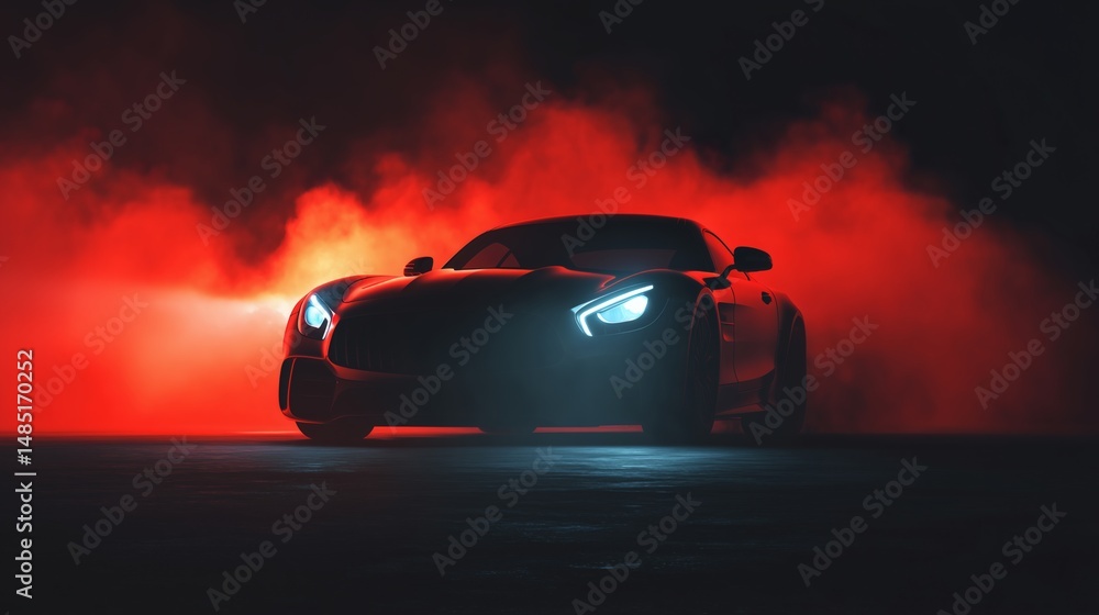 High-end car in smoke with glowing lights, Luxury sports car in red haze, Automotive concept for speed or branding themes #1485170252