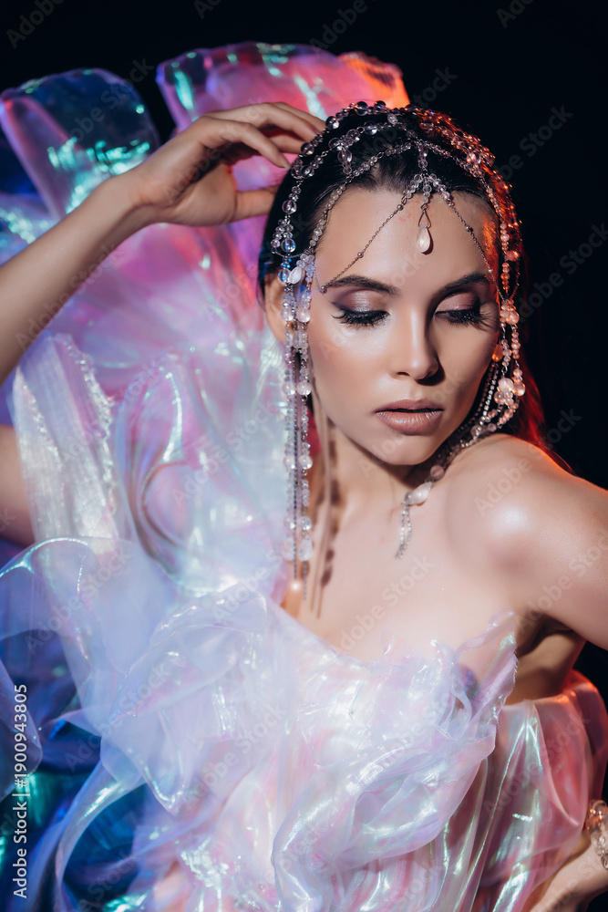 High Fashion art portrait model woman in colorful bright neon lights posing, portrait of beautiful fantasy girl, trendy make-up and holographic tulle, colorful make up, Vivid makeup #1900943805