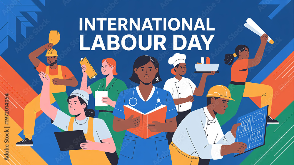 High-quality illustration or photo for International Labour Day, featuring diverse workers in action, vibrant and professional composition #1972014054