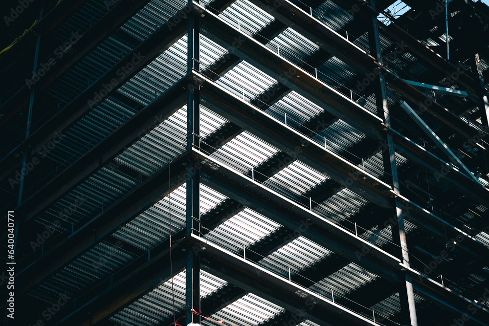 High rise building under construction showing girders and metal floors. Horizontal orientation. #640040771