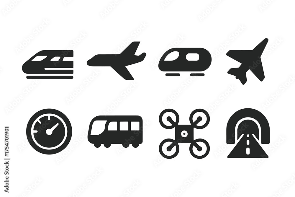 High-Speed Travel Icons. High-speed travel. Filled icon set of High-speed travel: bullet train, airplane, #1754701901