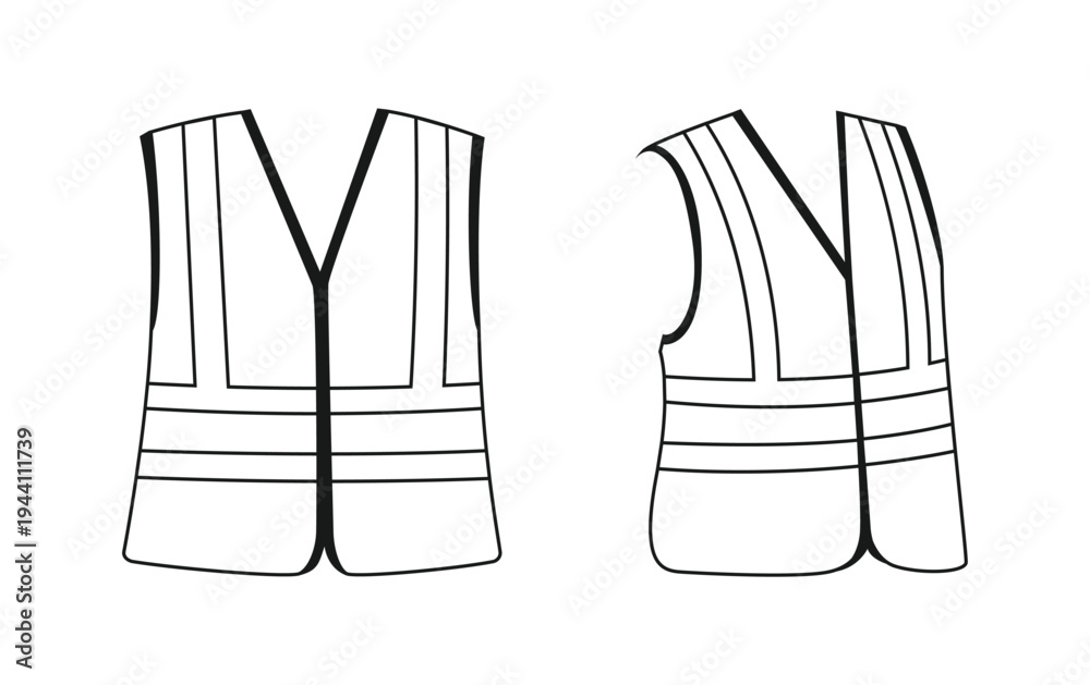 High Visibility Safety Vest Outline Illustration. Reflective Yellow Personal Protective Equipment (PPE) for Construction Workers and Site Safety. Coloring Book Page Template. #1944111739